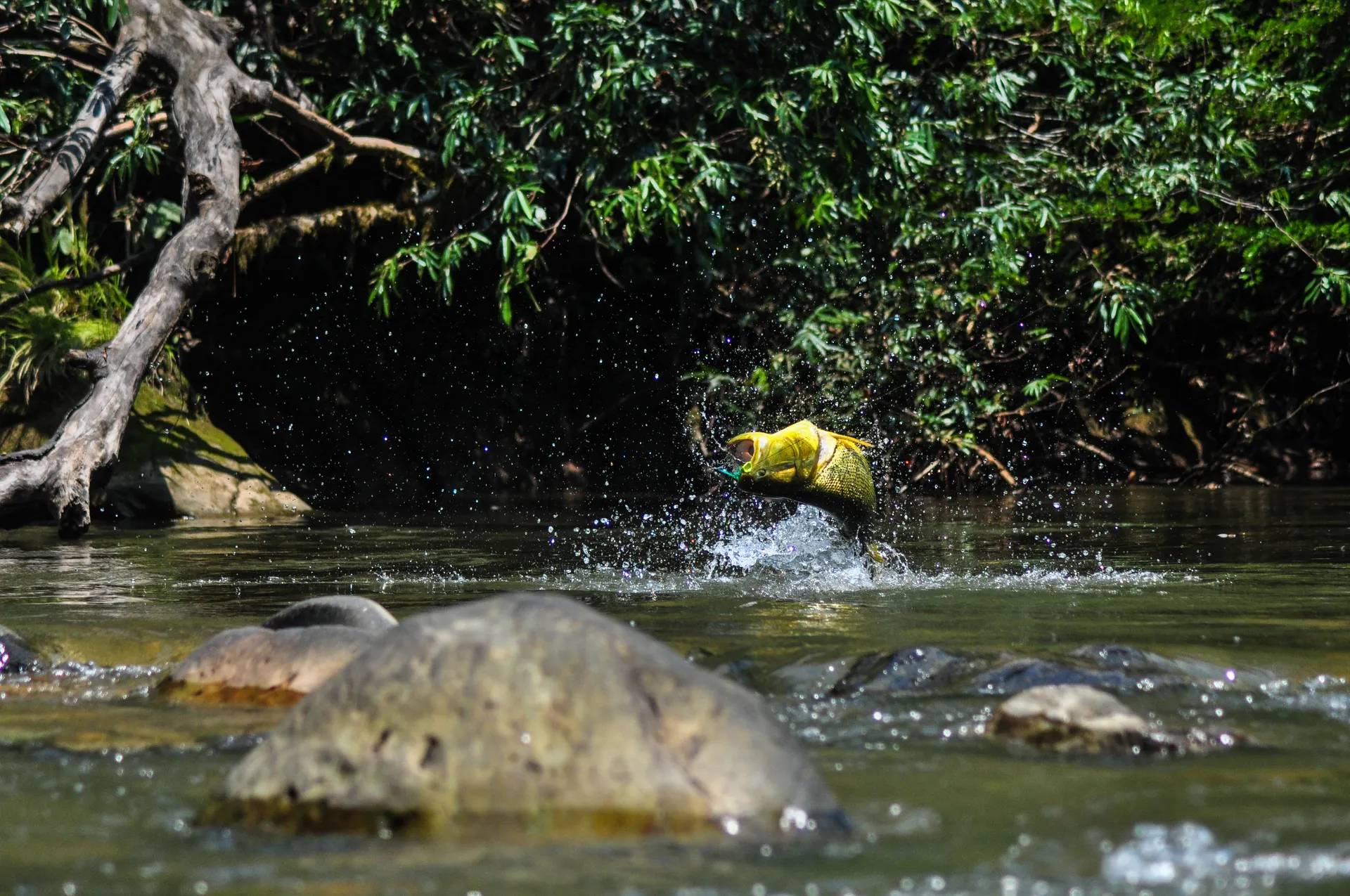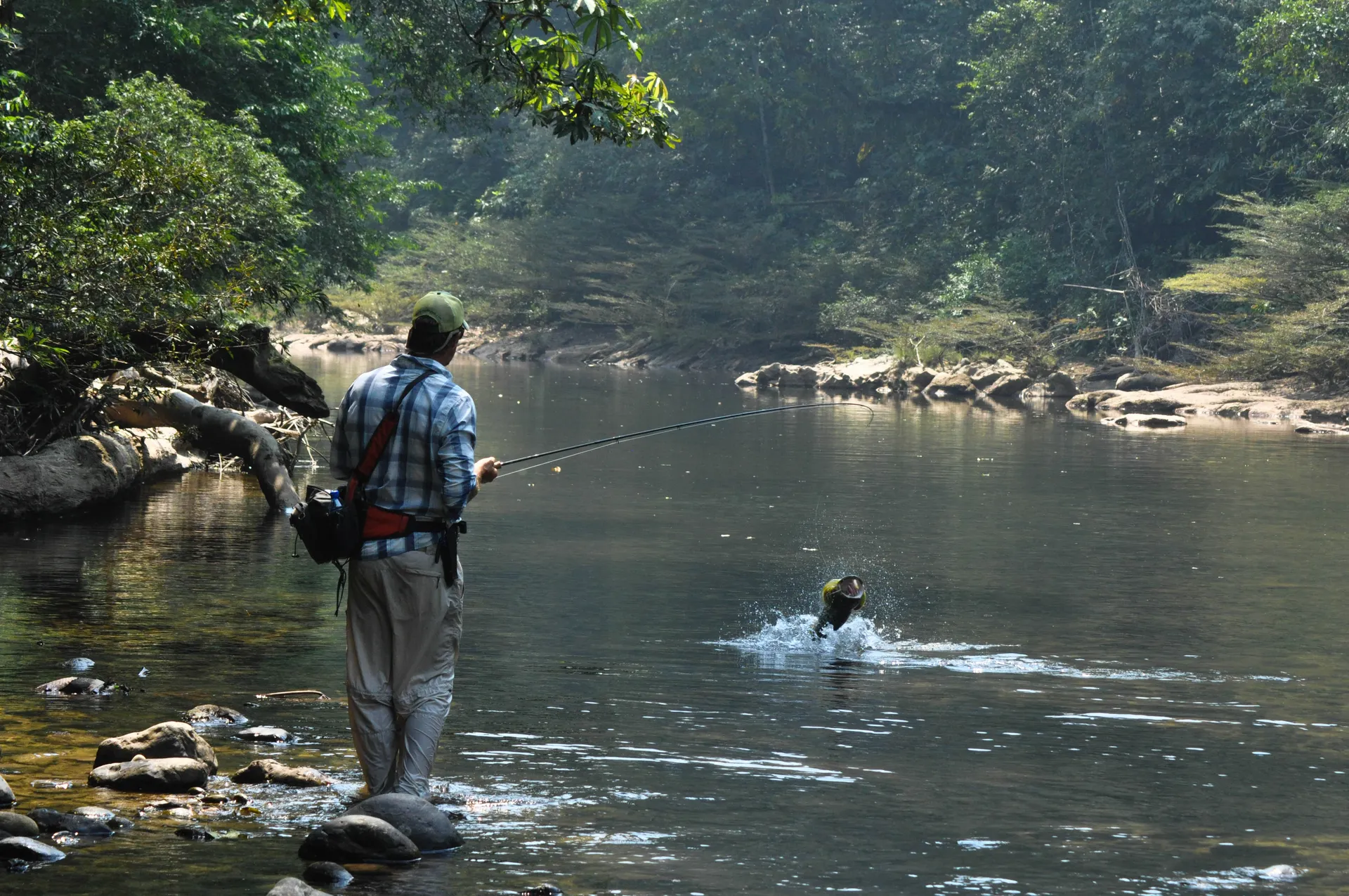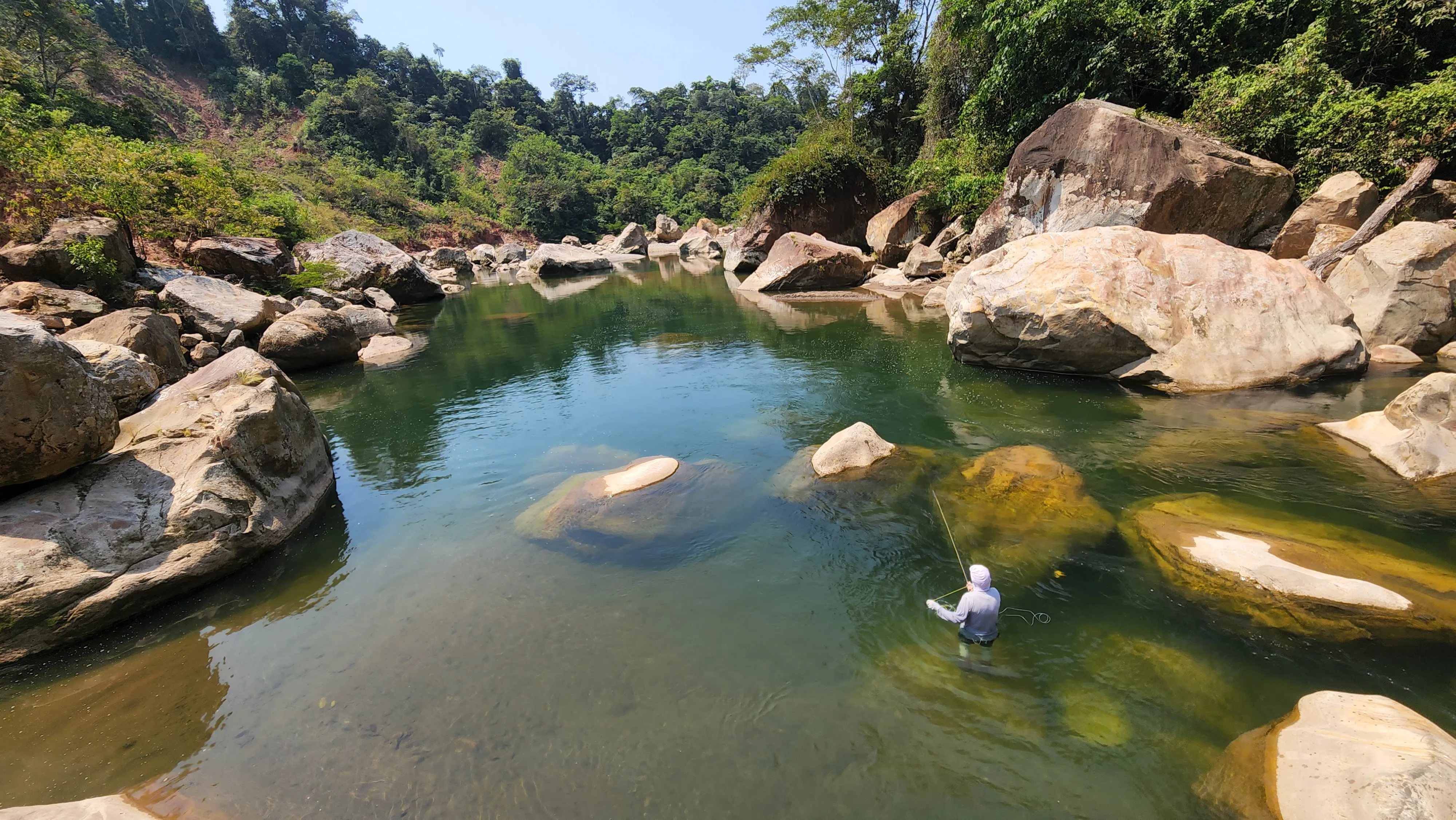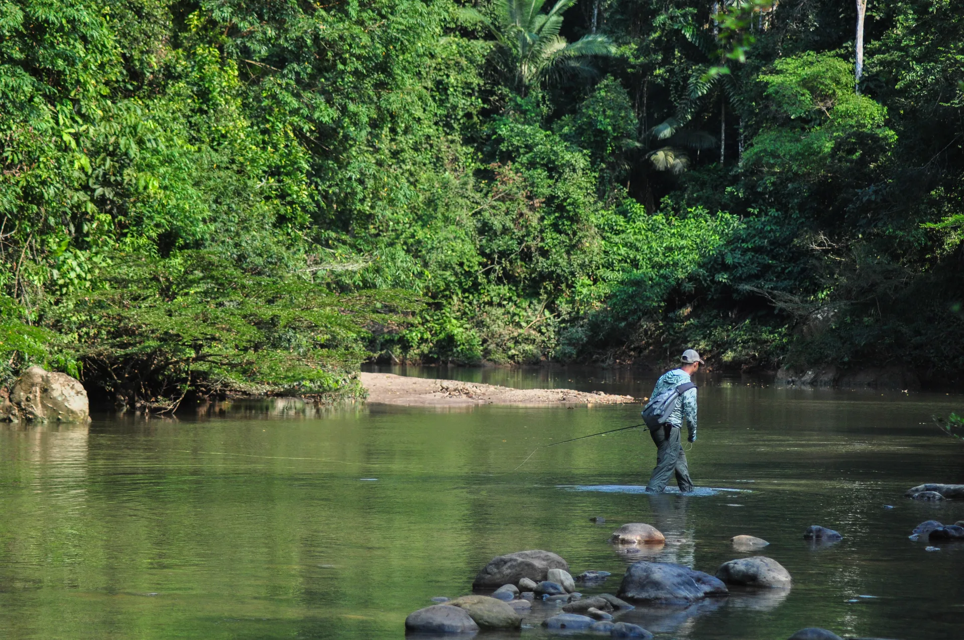 Both Secure Lodge and Pluma Lodge waters that you can reach out in the helicopter are quite similar. Crystal clear water, big boulders, freestone like, medium to small size river, pocket water. That’s why a lot of times you’ll feel like you are fishing for trout, and actually, they tend to behave like trout, sitting behind rocks and on tailouts.